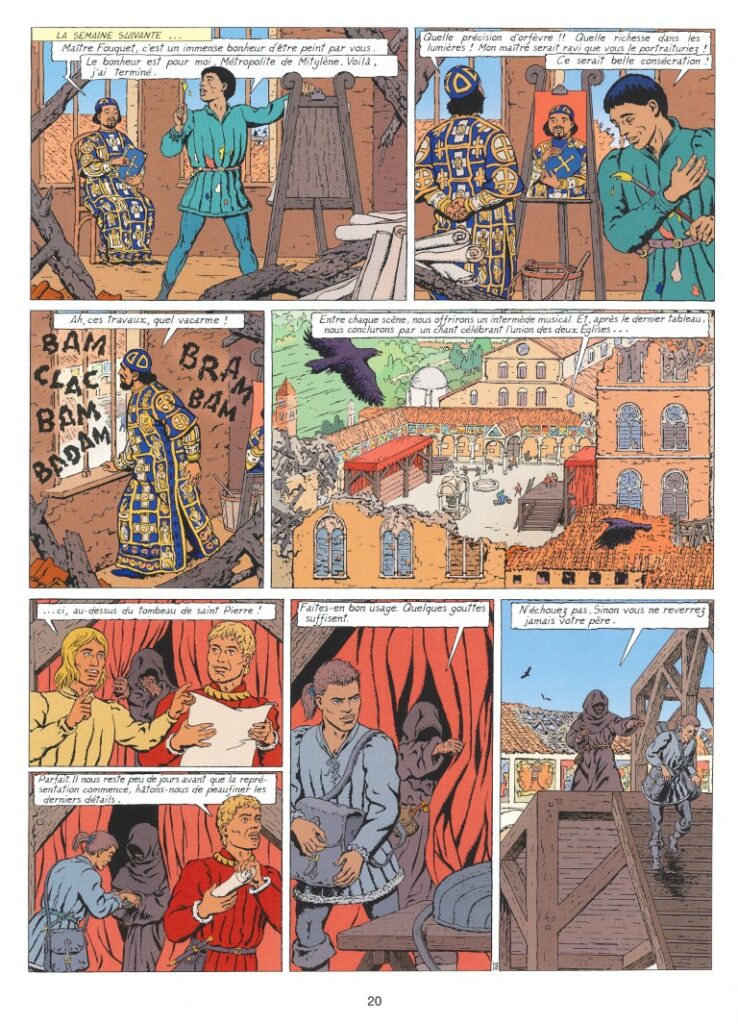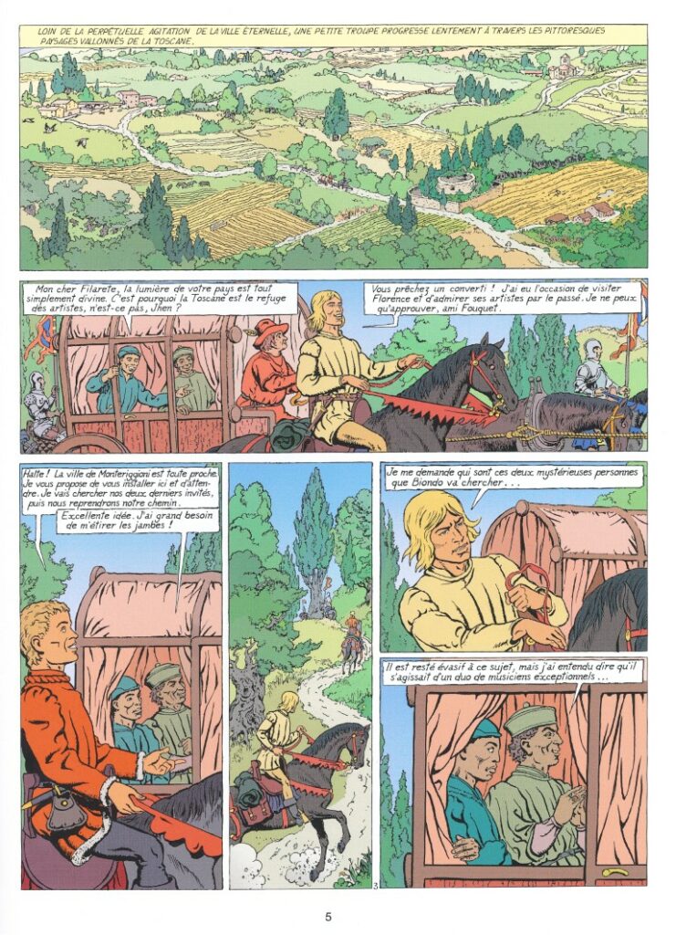 Ainsi est planté le décor de cette nouvelle aventure trépidante pour notre architecte – artiste – scénographe dramaturge, Jhen, créé par Jacques Martin en 1978. A cette belle équipée se joint Angeline de Waldo, chanteuse et musicienne, dont la voix est un don céleste, une mélodie enchanteresse qui charme les cœurs et captive les âmes. Pourtant, accompagnée de son frère Athanasius, elle semble avoir un projet caché en se faisant admettre au sein des proche d’Eugène IV. La fratrie Waldo serait-elle l’instrument d’un complot visant le Saint-Père ? Et quels seraient les moyens de pressions exercés sur eux par ce mystérieux moine encapuchonné qui semble dirigé cette conspiration ?