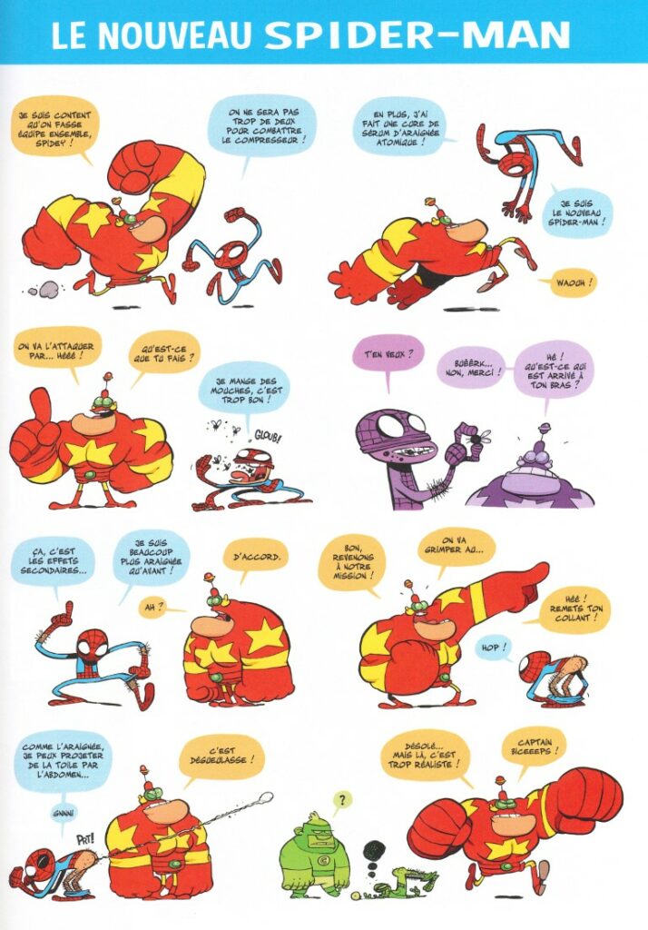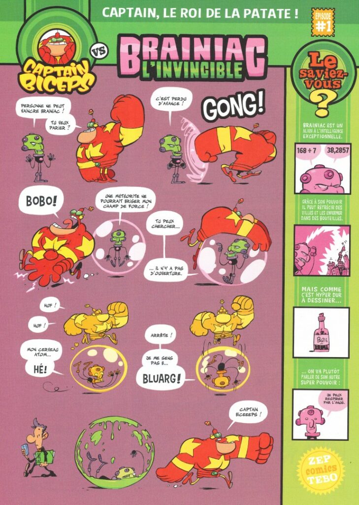 Le monde n’a rien à craindre. Le président de la plus grande puissance de la Terre et les autres peuvent dormir sur leurs deux oreilles. Le Captain Biceps veille. Le voici enfin de retour pour notre plus grand bonheur et pour le plus grand malheur des super-vilains qu’il va castagner. Brainiac l’invincible aura beau se réfugier dans sa sphère champ de force il risque de choper une sacrée nausée. Abeilles-Man, la ruche vivante, pourra piquer qui elle veut, elle ne pourra rien contre la boîboîte de Biceps. Même les super-héros Marvel ne feront pas le poids. Captain America va voir plus d’étoiles que sur le drapeau de son pays. Le Docteur Strange va vite arrêter de faire le malin, tout comme le nouveau Spider-Man, toujours nouveau, qui projette sa toile par l’abdomen, le dégueulasse.