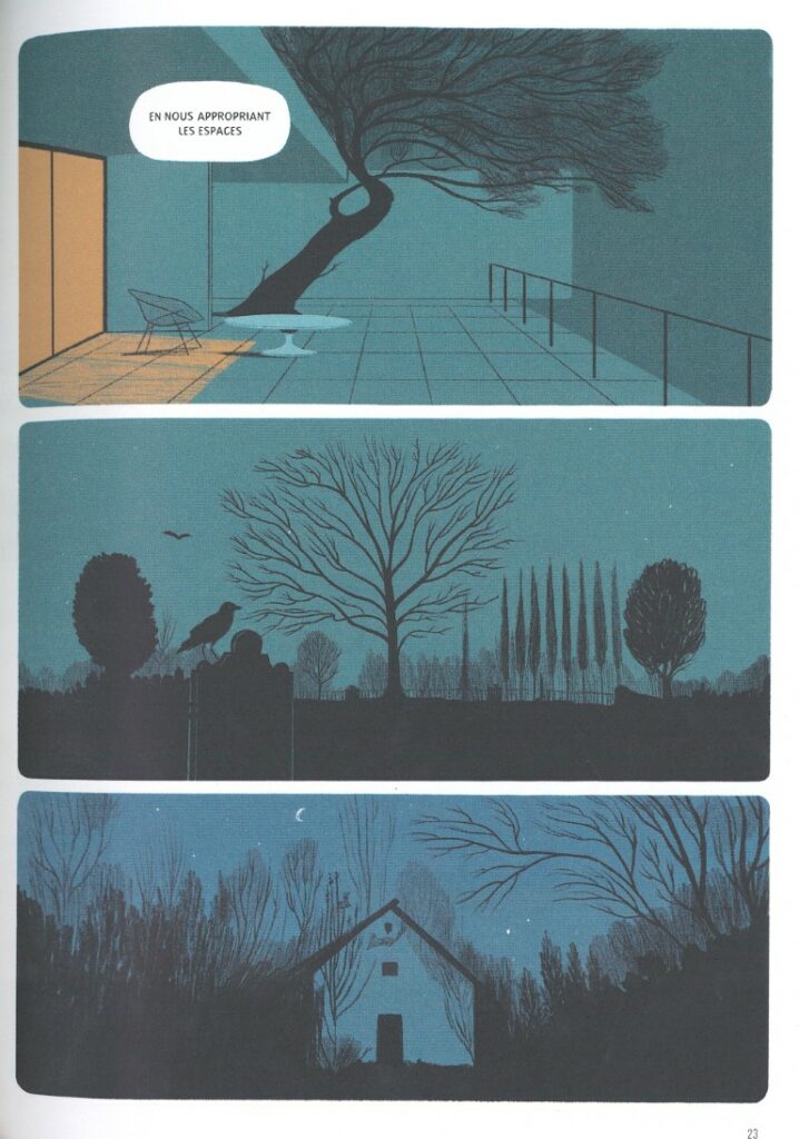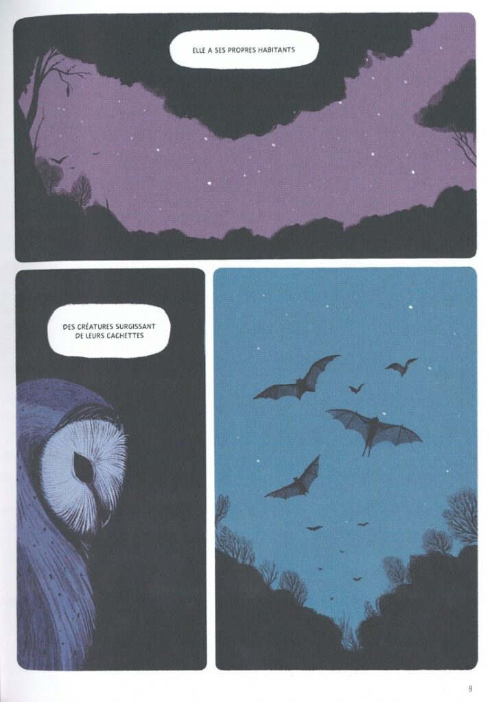 « La nuit est l’état naturel de l’univers ; c’est de jour que les anomalies surviennent. » Cette citation de Jean-Paul Sartre reproduite en postface synthétise idéalement le propos de l’album. L’autrice espagnole Laura Pérez n’écrit pas et ne dessine pas une histoire. Elle créé une ambiance, une ambiance nocturne, cela va de soi. Entre rêve et réalité, on ne sait pas toujours où l’on est. Pérez convoque David Lynch et Guillermo Del Toro pour une expérience qui pourrait être sortie de leurs films. Dans Nocturnos, le temps ne passe pas de façon linéaire. Il se recycle. Il n’y a pas de début, il n’y a pas de fin. Laura Pérez invite à la méditation.