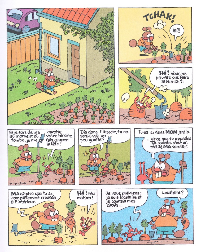 Flitop est une sorte d’écureuil qui cultive son jardin. Son potager est ravagé par des insectes qui boulottent ses carottes, mais qui lui promettent de trouver un arrangement. Par ailleurs, un agent de police qui passait par là lui fait remarquer que les racines d’un arbre de son jardin dégradent la voie publique. Il va falloir l’abattre. Demain matin, deux ouvriers municipaux viendront pour accomplir la tâche. C’est donc un Flitop complètement déprimé que trouve son copain Jean-Claude en arrivant chez lui. Pas question de laisser son pote abattu de la sorte. Jean-Claude veut commencer par éradiquer les insectes. Pour Flitop, pas question de se transformer en meurtrier. Il a d’abord besoin de changer d’air. Les deux compères vont sur les hauteurs de la ville pour voir le soir se lever.